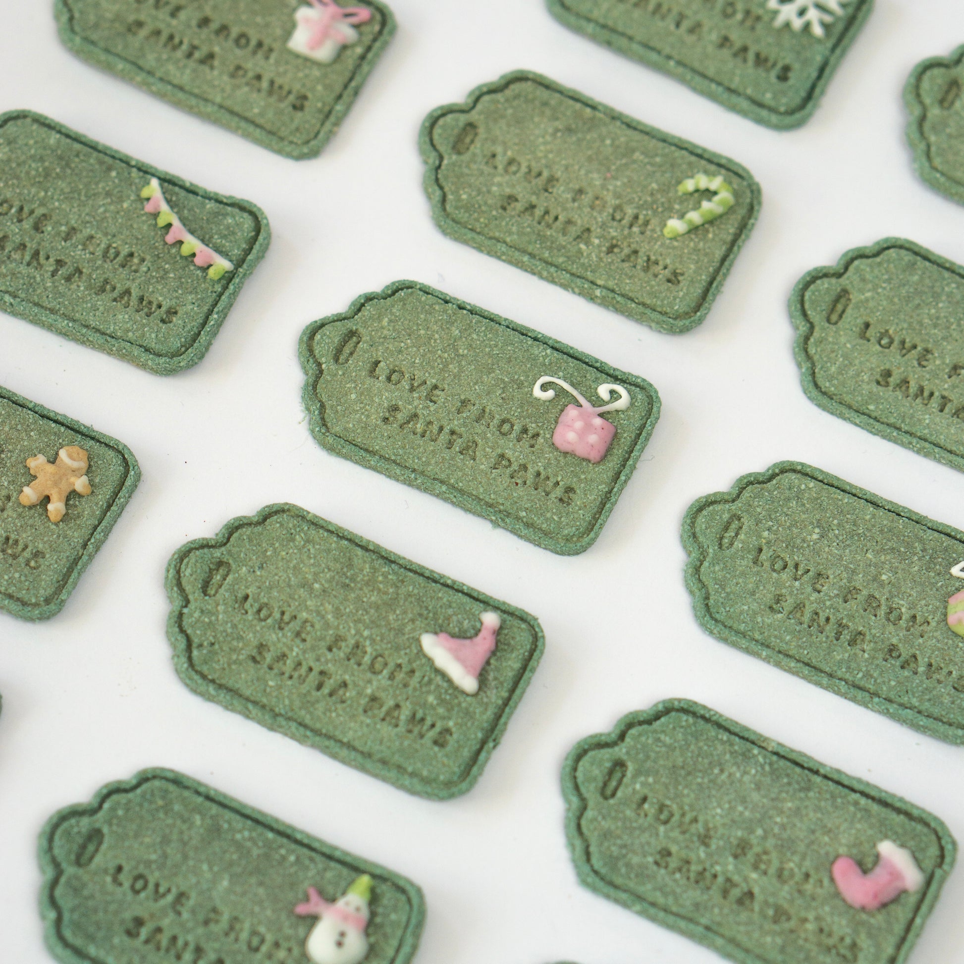Christmas tag cookies that look like they came straight out of Santa Paws’ workshop. Stamped with “LOVE FROM SANTA PAWS” and topped with a cute, hand-piped christmas charm.